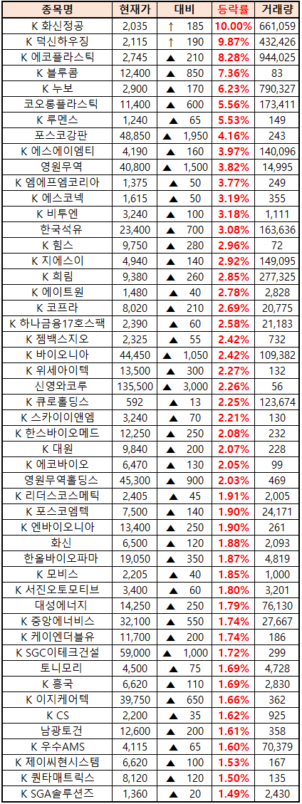 2022년 3월 10일 시간외 단일가 상한가 및 이유 :: 화신정공 덕신하우징 에코플라스틱 누보 주가 외