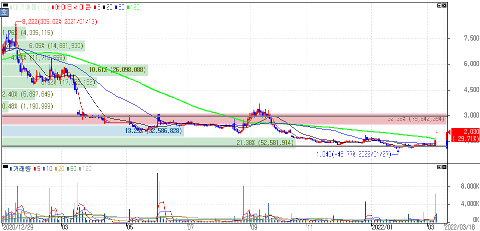 대규모 자금조달 결정에 상한가를 기록한 에이티세미콘 주가 입니다.