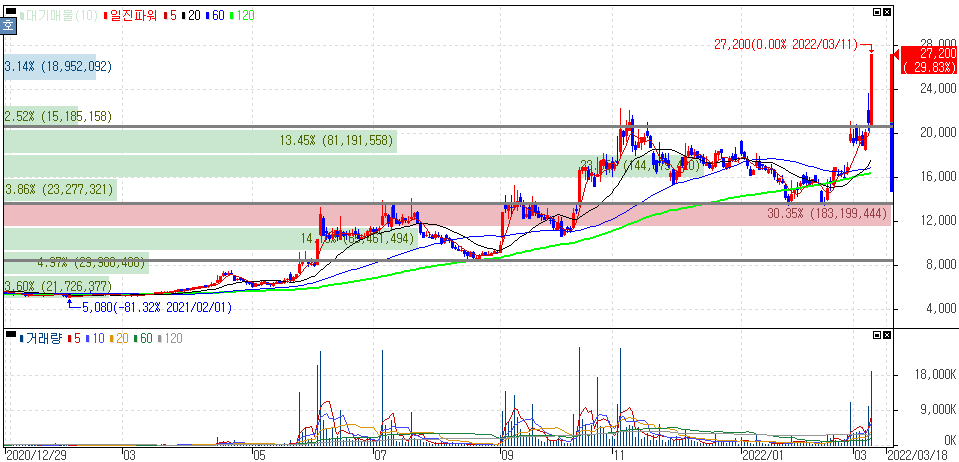 윤석열 대통령 당선인, 원전 공약 수혜 기대감 지속 등에 상한가를 기록한 한신기계, 일진파워 주가 입니다.