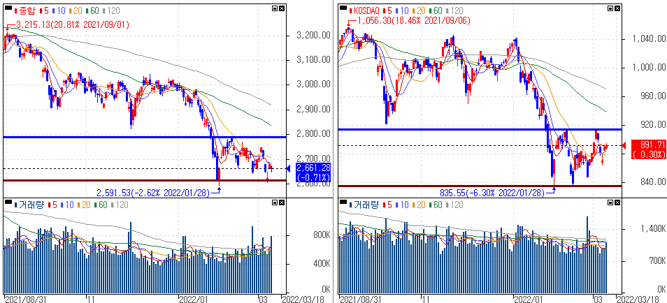 금일 코스피 지수는 -0.71% 하락한 2,661.28에 마감하였고, 코스닥 지수는 +0.30% 상승한 891.71에 마감하였습니다. 러시아-우크라이나 전쟁 장기화 우려 및 중국 제재 확대 가능성에 마감하였습니다.