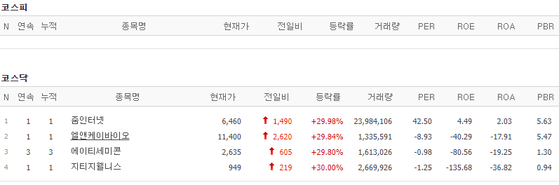 코스피에서는 상한가 종목이 없었고, 코스닥에서는 줌인터넷, 엘앤케이바이오, 에이티세미콘, 지티지웰니스가 상한가를 기록했습니다.