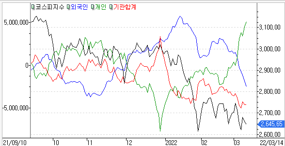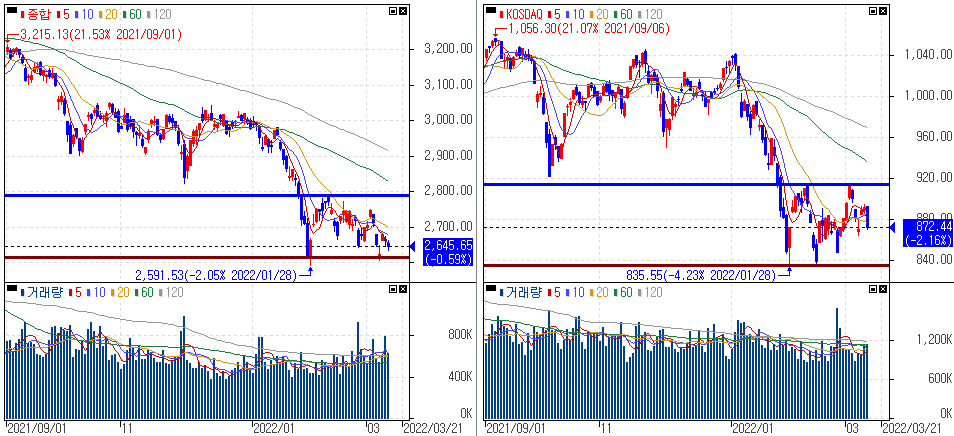 금일 코스피 지수는 -0.59% 하락한 2,645.65에 마감하였고, 코스닥 지수는 -2.16% 하락한 872.44에 마감하였습니다. 러시아와 우크라이나 전쟁으로 지정학적 리스크 지속, 미국 물가를 중심으로 인프레이션과 경기둔화우려, FOMC 관망세 등에 투자심리위축을 보였습니다.