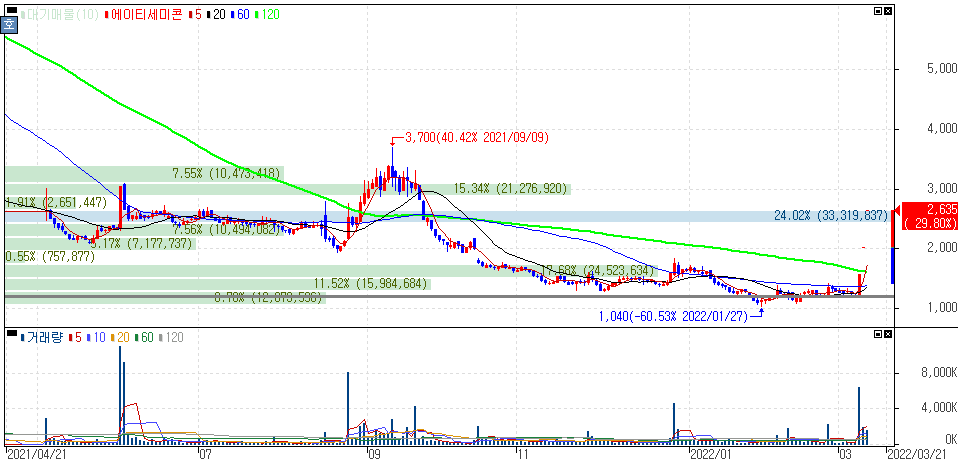 에이티세미콘, 대규모 자금 조달로 연속 상한가를 기록한 에이티세미콘 주가 입니다.