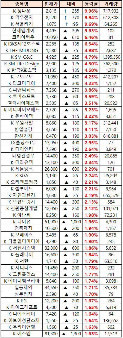 (종목명 앞에 'K'는 코스닥 종목을 의미합니다.)