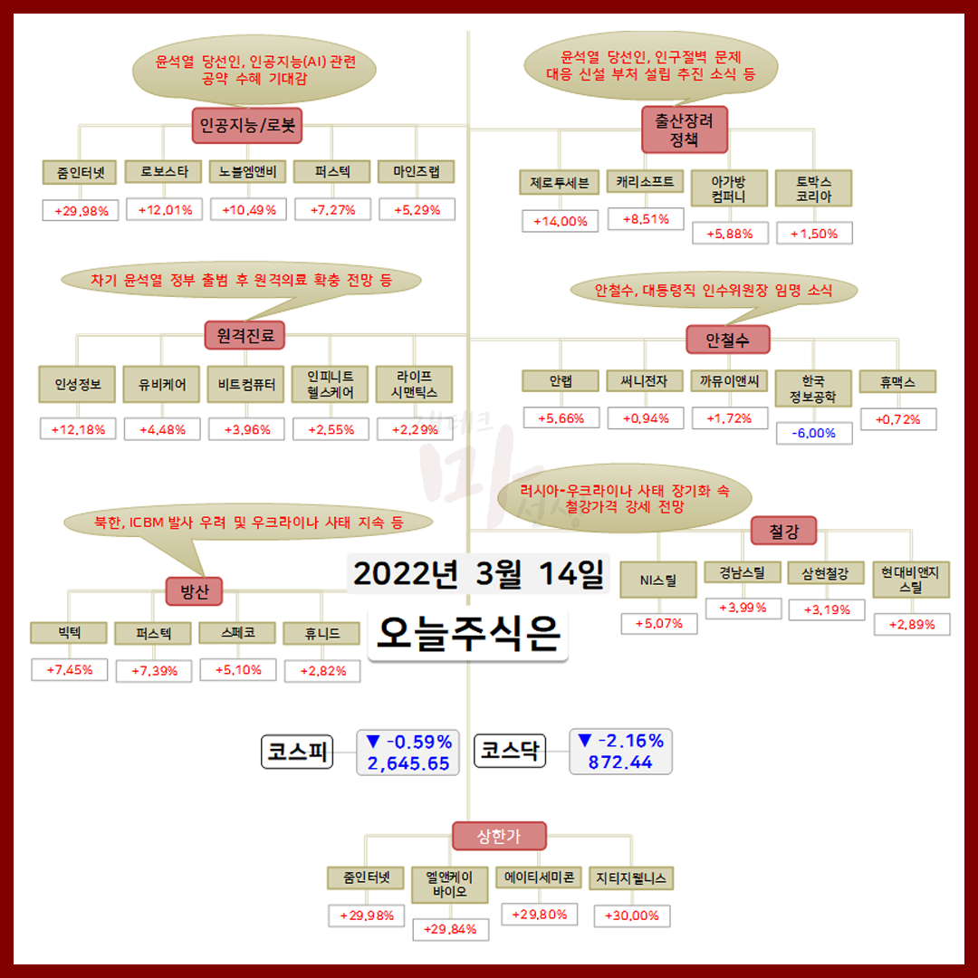 2022년 3월 14일 오늘의 상한가 종목 및 이유 :: 줌인터넷 엘앤케이바이오 지티지웰니스 주가 외 지난 뉴욕증시는 러시아-우크라이나 전쟁 장기화 등에 하락을 보였는데요. 다우 지수는 -0.69% 하락
