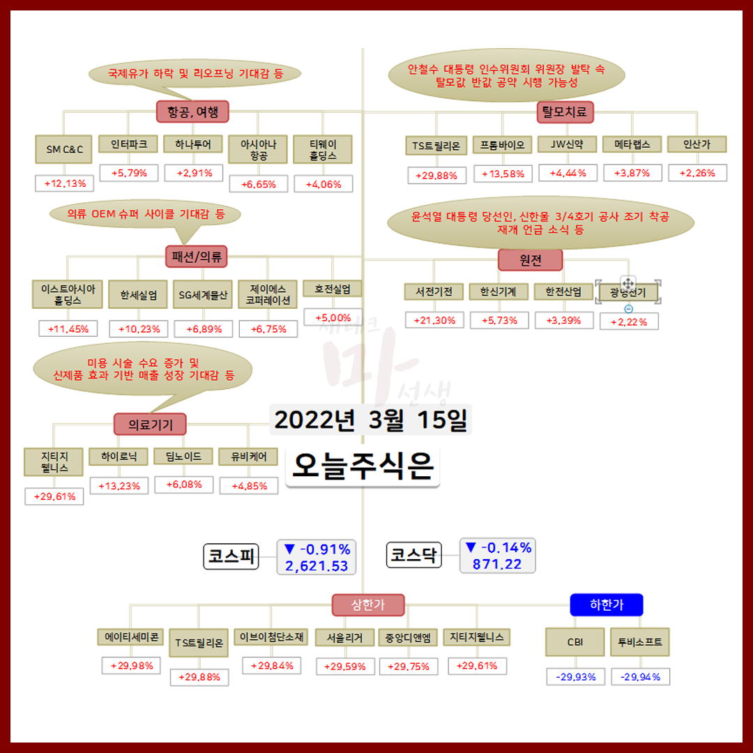 2022년 3월 15일 오늘의 상한가 종목 및 이유 :: TS트릴리온 이브이첨단소재 서울리거 중앙디앤엠 지티지웰니스 주가 외 지난 뉴욕증시는 러시아-우크라이나 회담 주목 및 FOMC 경계심 속 혼조로 마