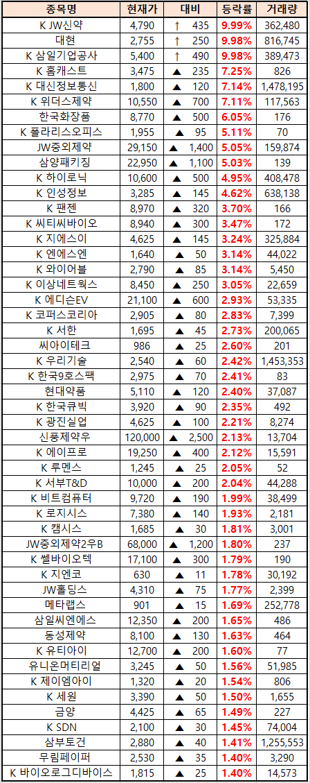 시간외 단일가매매 종가 종목 확인시 단순 급등주 등락률만 볼 것이 아니라, '거래량'에 따르는 거래대금도 판단하면서 보는 것이 중요합니다.