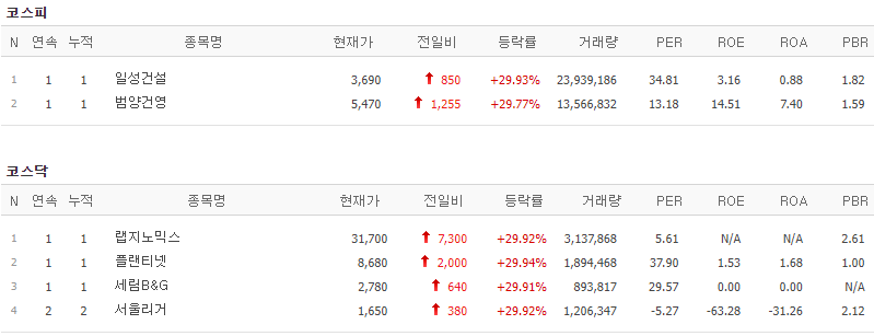 코스피에서는 일성건설, 범양건영이 상한가를 기록했고, 코스닥에서는 랩지노믹스, 플랜티넷, 세림B&G, 서울리거가 상한가를 기록했습니다.
