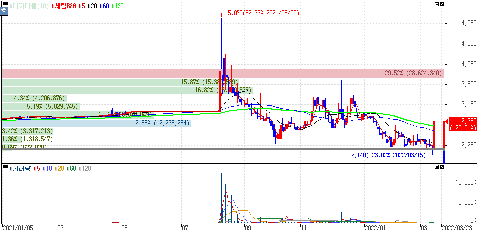 국내 최대 친환경 플라스틱용 원료(컴파운드) 공급기업 그린바이오가 10년간 3조원 규모의 수주계약 소식이 나왔는데요. 세림B&G에서도 진공성형 기술을 이용한 식품 포장용 플라스틱 용기와 친환경 생분해 원료를 이용한 생분해 필름을 제조 및 판매하는 업체라는 점에서 부각을 보였습니다.