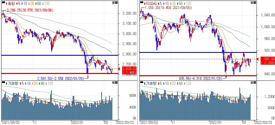 금일 코스피 지수는 +1.44% 상승한 2,659.23에 마감하였고, 코스닥 지수는 +2.36% 상승한 891.80에 마감하였습니다. 국제유가 하락과 함께 인플레이션 우려도 다소 완화된 분위기로 미증시에 이어 상승을 보였습니다.