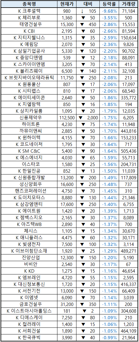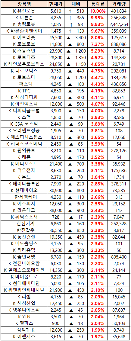 (종목명 앞에 'K'는 코스닥 종목을 의미합니다.)