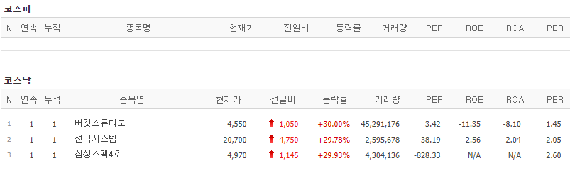 코스피에서는 상한가 종목이 없었고, 코스닥에서는 버킷스튜디오, 선익시스템, 삼성스팩4호가 상한가를 기록했습니다.