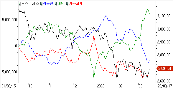 금일 코스피 지수는 +1.33% 상승한 2,694.51에 마감하였고, 코스닥 지수는 +2.50% 상승한 914.13에 마감하였습니다. 미국 기준금리 인상에 대한 우려와 러시아-우크라이나 사태 대한 우려가 다소 해소되면서 미국증시에 이어 상승을 보였습니다.