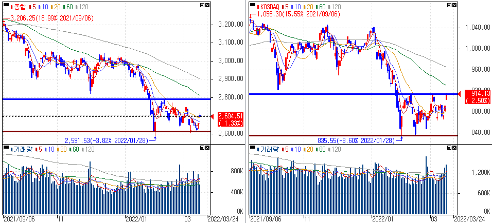 금일 코스피 지수는 +1.33% 상승한 2,694.51에 마감하였고, 코스닥 지수는 +2.50% 상승한 914.13에 마감하였습니다. 미국 기준금리 인상에 대한 우려와 러시아-우크라이나 사태 대한 우려가 다소 해소되면서 미국증시에 이어 상승을 보였습니다.