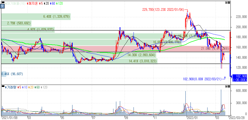 메지온 주가 :: 2022년 3월 21일 오늘의 하한가 종목