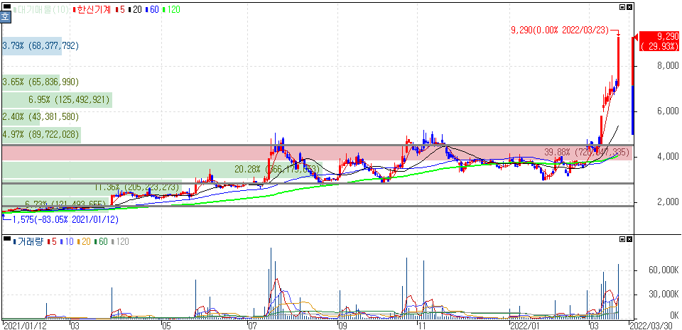 영국, 원전 비중 확대 소식 및 윤석열 대통령 당선인의 원전 공약 수혜 기대감 지속 등에 원자력 테마주 상승 속 상한가를 기록한 한신기계 주가 입니다.