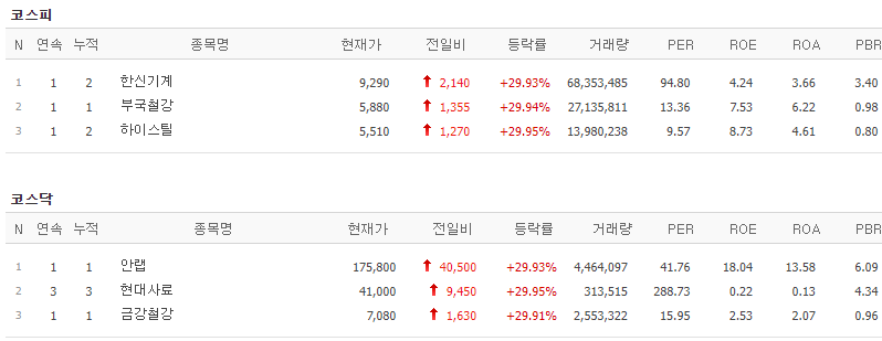 코스피에서는 한신기계, 부국철강, 하이스틸이 상한가를 기록했고, 코스닥에서는 안랩, 현대사료, 금강철강이 상한가를 기록했습니다.