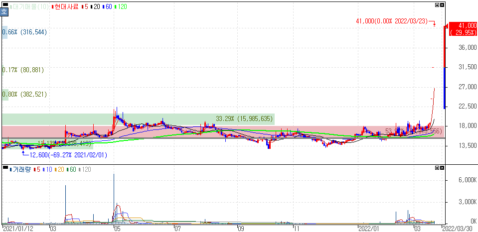 국제곡물가격 상승 속 일부 사료 관련주 상승 및 최대주주 변경 수반 주식양수도 계약 체결 모멘텀 지속으로 상한가를 기록한 현대사료 주가 입니다.