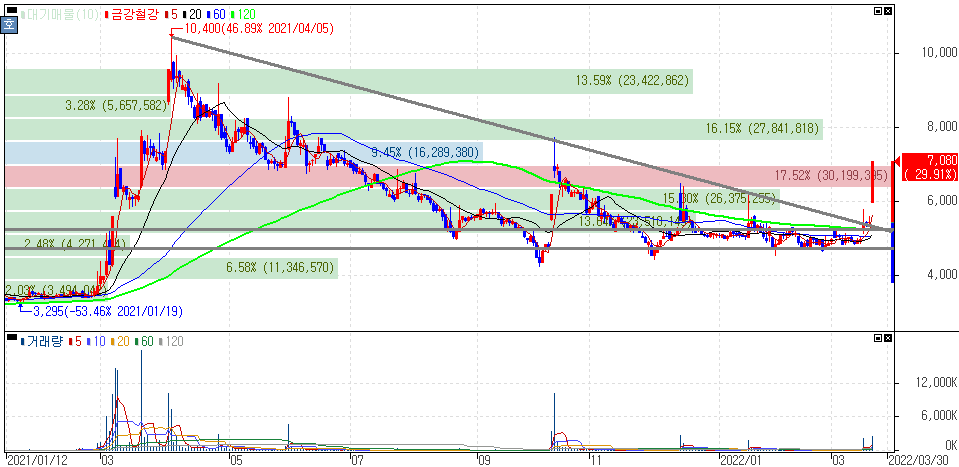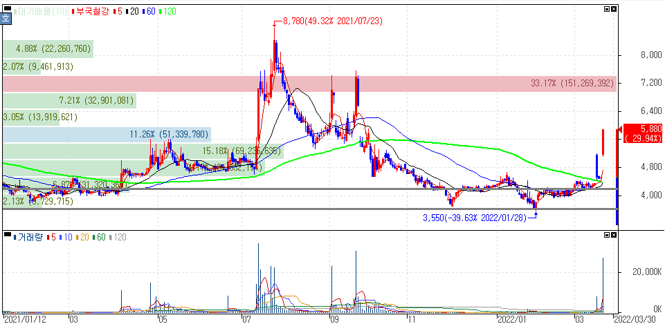 원자재 가격 및 물가 상승의 지속화로 인한 주가 상승을 보이는 종목이 오늘도 많았는데 무조건 그 기대감으로만 접근하기 보다는 적정 가격대를 고려해보고, 극단적으로 과열증상을 보이고 있는 종목 접근은 상당히 주의해야 합니다.