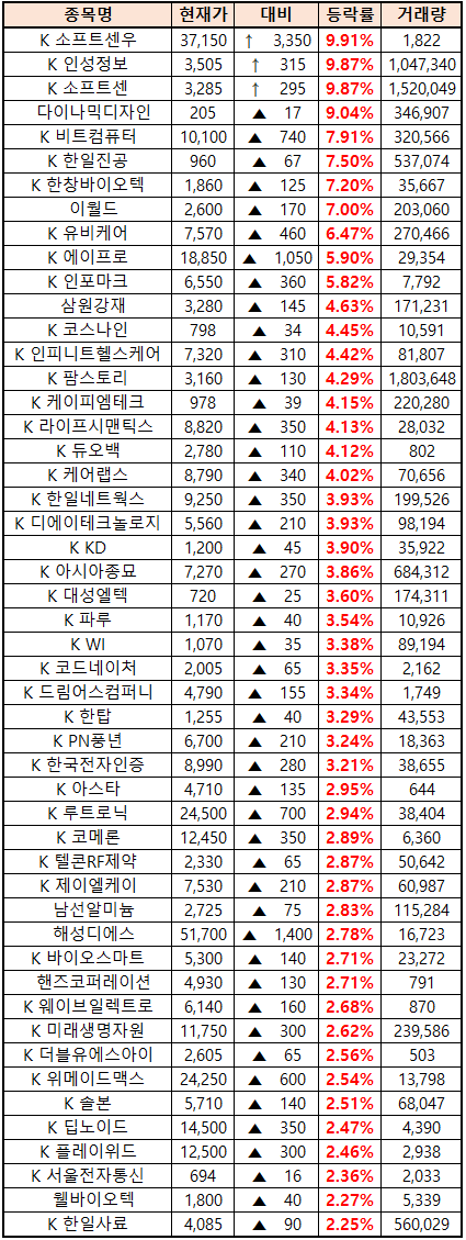 (종목명 앞에 'K'는 코스닥 종목을 의미합니다.)