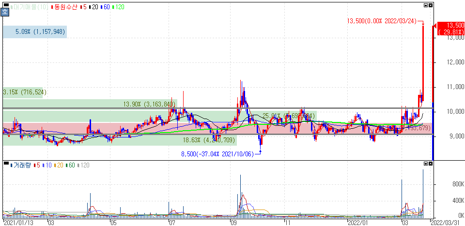 러시아 항공로 폐쇄에 따른 수산물 가격 폭등 속 수혜 기대감 등에 상한가를 기록한 동원수산, 한성기업 주가 입니다.