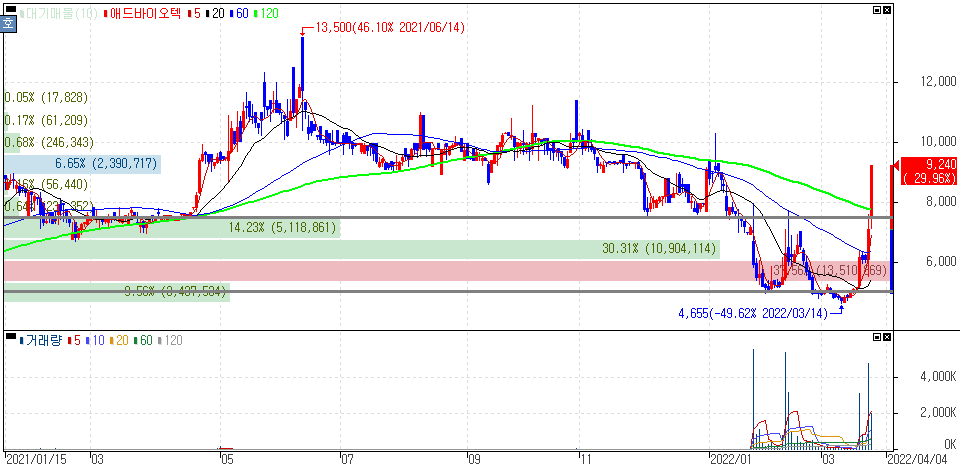 카나리아바이오(두올물산), 현대사료 인수 기대감 속 관련주로 부각되면서 상한가를 기록한 애드바이오텍 주가 입니다.