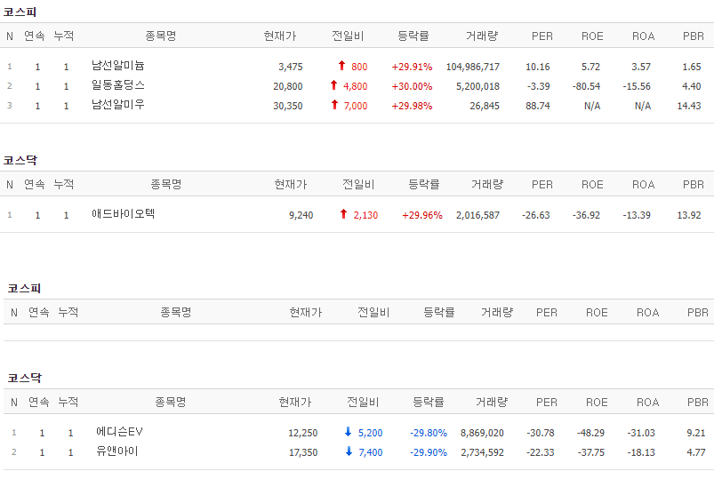 코스피에서는 남선알미늄, 일동홀딩스, 남선알미우가 상한가를 기록했고, 코스닥에서는 애드바이오텍이 상한가를 기록했습니다. 반면 에디슨EV, 유앤아이가 하한가를 기록했습니다.