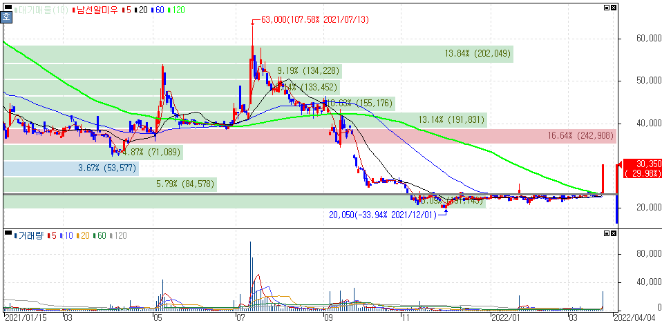 호주가 러시아향 알루미나, 알루미늄 수출 금지 등에 따른 알루미늄 가격 강세에 상한가를 기록한 남선알미늄, 남선알미우 주가 입니다.