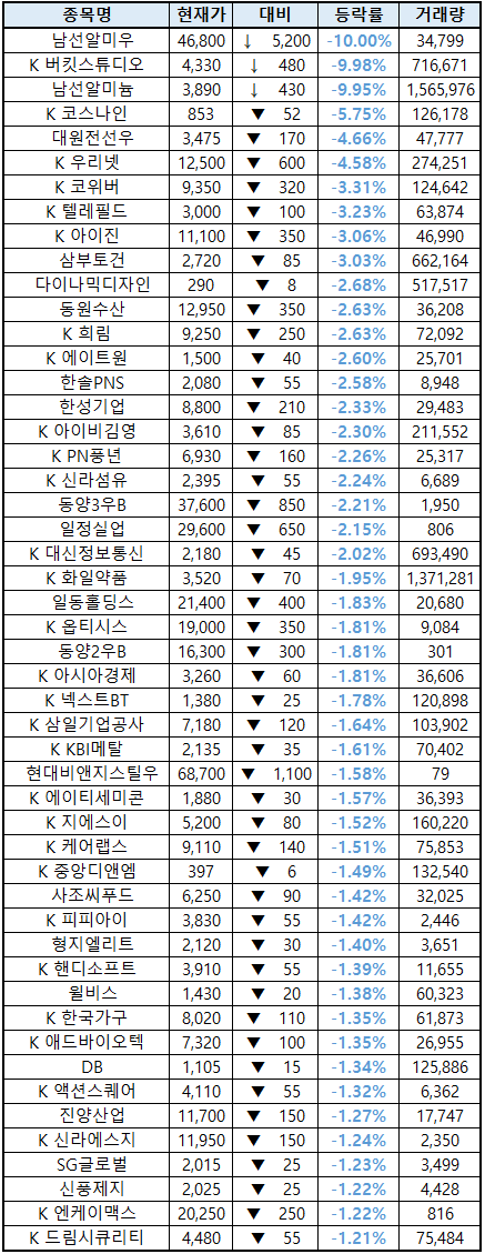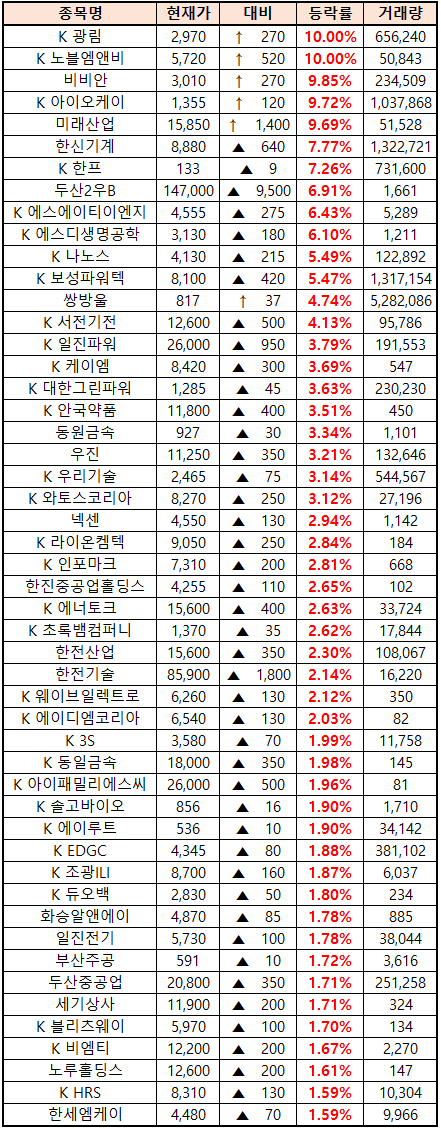 (종목명 앞에 'K'는 코스닥 종목을 의미합니다.)