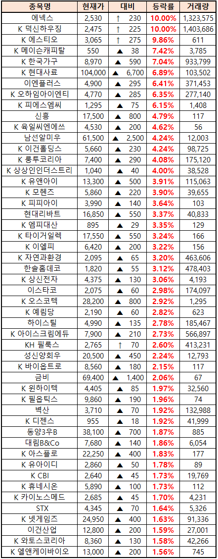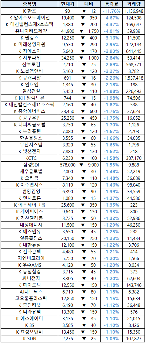 (종목명 앞에 'K'는 코스닥 종목을 의미합니다.)