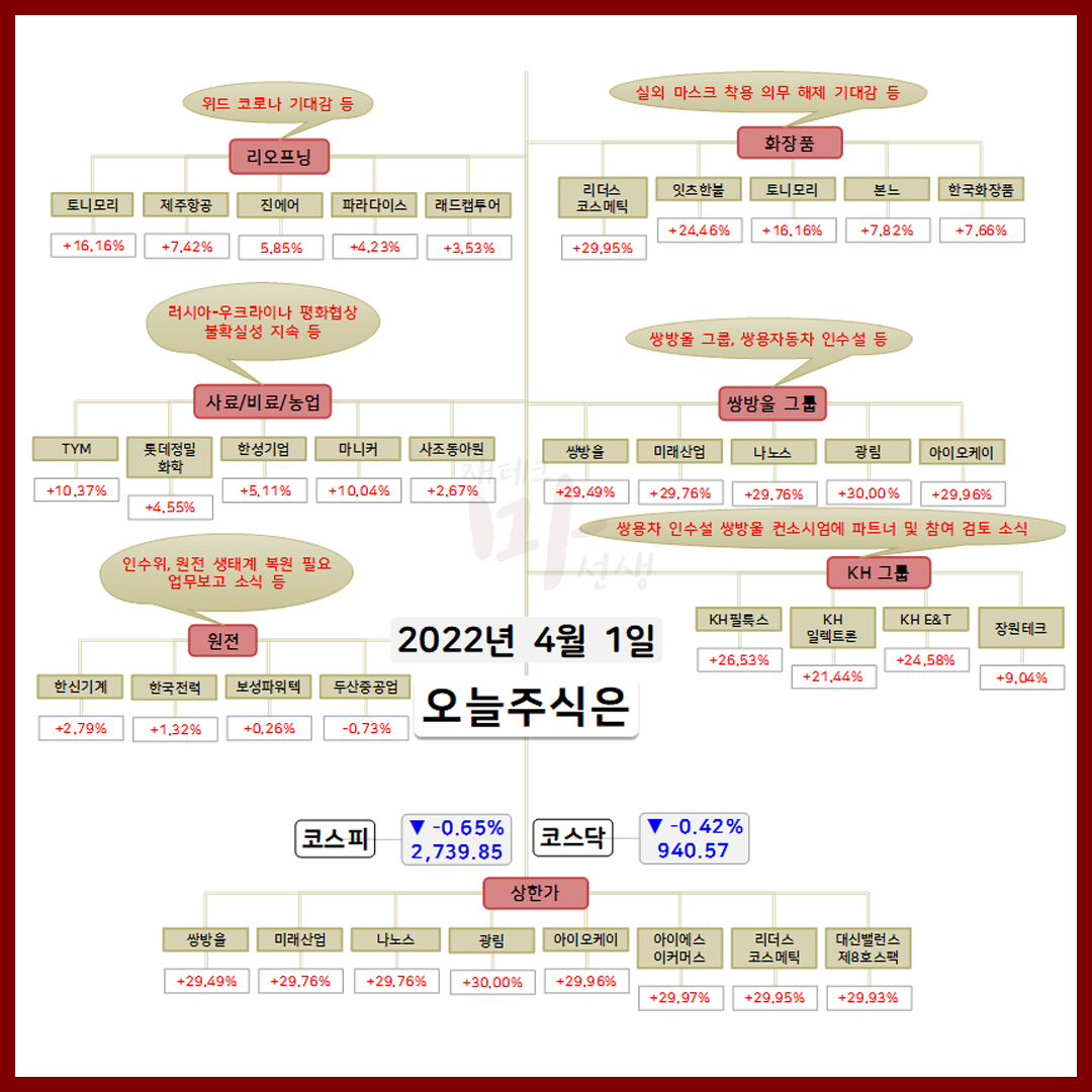 4월 1일 오늘의 상한가 종목 및 이유 :: 쌍방울 그룹주 아이에스이커머스 리더스코스메틱 대신밸