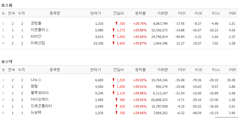 코스피에서는 쌍방울, 이엔플러스, 비비안, 미래산업이 상한가를 기록했고, 코스닥에서는 나노스, 광림, 룽투코리아, 아이오케이, 드래곤플라이, 뉴보텍이 상한가를 기록했습니다.