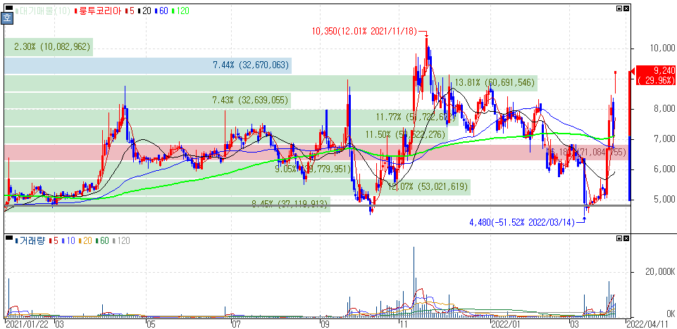 열혈강호 글로벌 흥행 기대감에 상한가를 기록한 룽투코리아 주가 입니다.