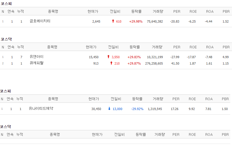 코스피에서는 금호에이치티가 상한가를 기록했고, 코스닥에서는 유앤아이, 큐캐피탈이 상한가를 기록했습니다. 반면 유나이티드제약이 하한가를 기록했습니다.