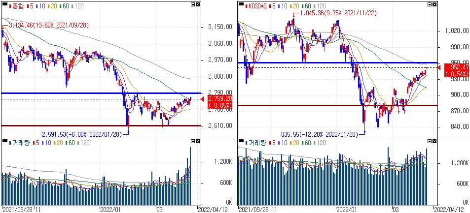금일 코스피 지수는 +0.05% 상승한 2,759.20에 마감하였고, 코스닥 지수는 +0.54% 상승한 952.47에 마감하였습니다. 막판 외국인의 순매수 전환을 보이며 상승을 보였지만 특별한 방향성을 보기 어려운 움직임입니다.