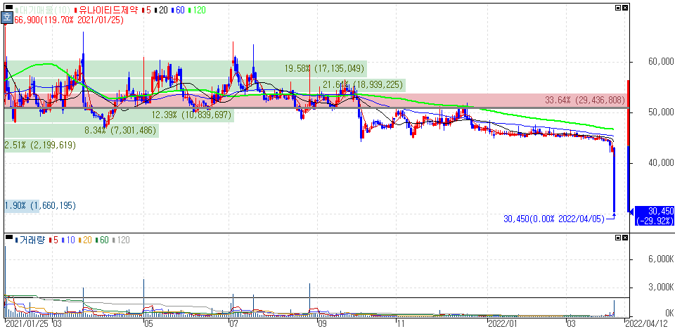 코로나19 흡입형 치료제 UI030 임상환자 모집 어려움 등 지속 속 하한가를 기록한 유나이티드제약 주가 입니다.