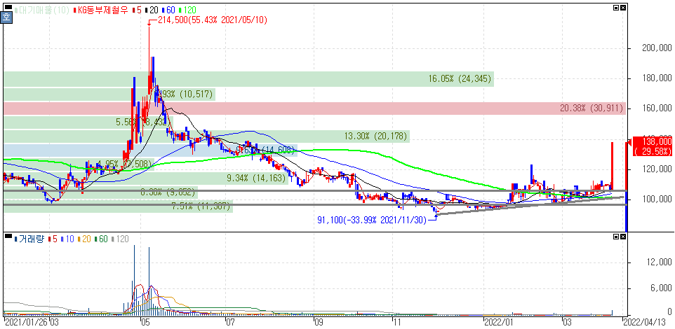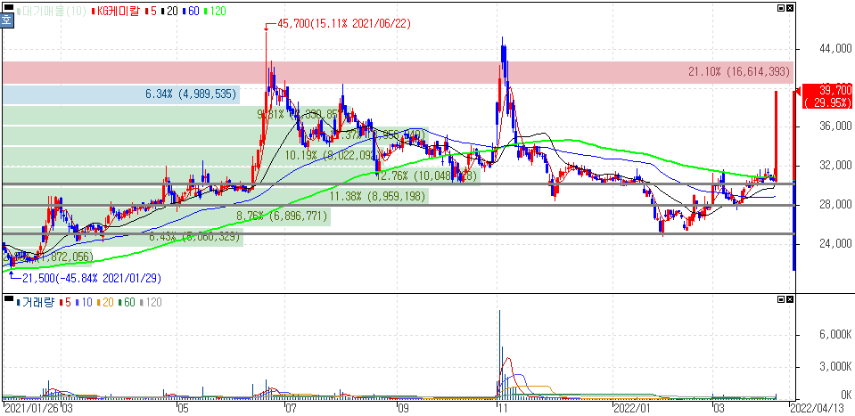 이에 KG케미칼(상한가), KG동부제철우(상한가), KG ETS(+22.96%), KG모빌리언스(+8.79%), KG동부제철(+14.03%), KG이니시스(+1.59%) 등의 종목이 있습니다.