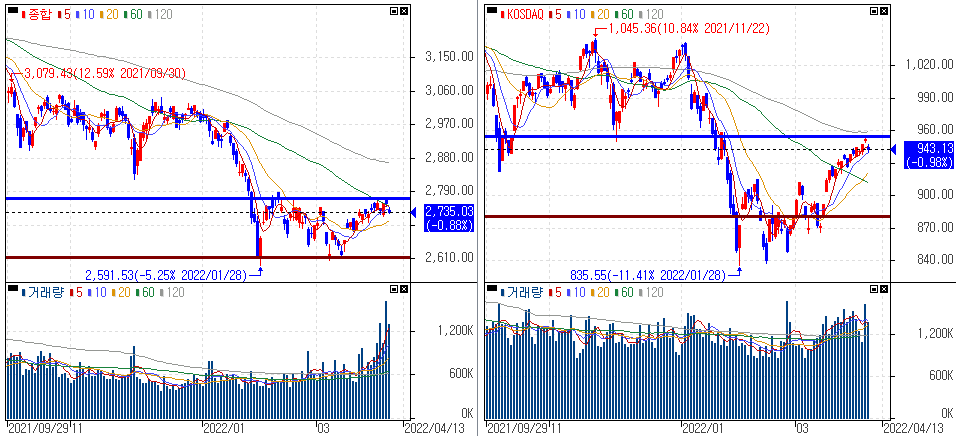 금일 코스피 지수는 -0.88% 하락한 2,734.82에 마감하였고, 코스닥 지수는 -1.01% 하락한 942.87에 마감하였습니다. 美 Fed의 더 매파적인 전망 영향 속 하락을 보였습니다.