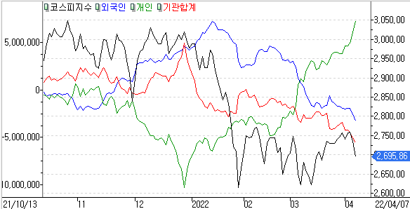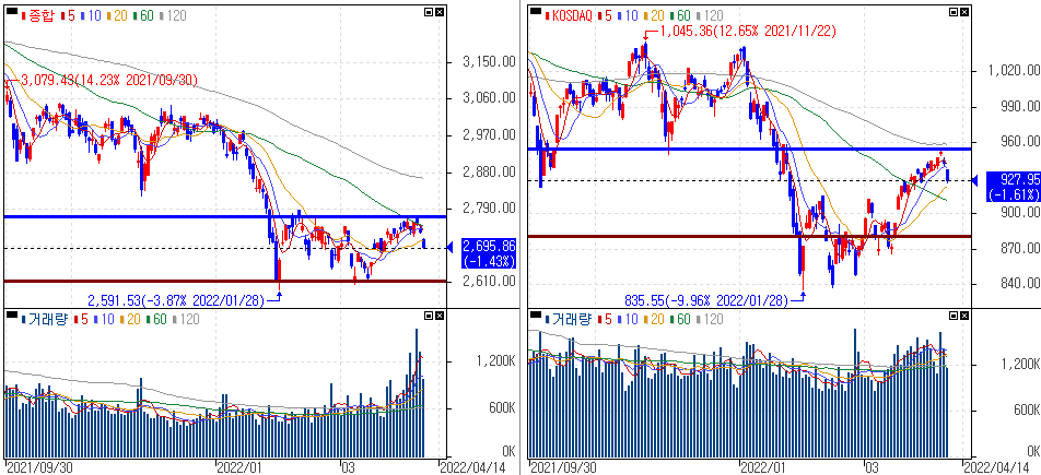 금일 코스피 지수는 -1.43% 하락한 2,695.86에 마감하였고, 코스닥 지수는 -1.61% 하락한 927.95에 마감하였습니다. 미국 긴축우려에 외국인과 기관의 매도물량이 연일나오면서 하락을 보였습니다.