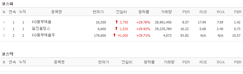 코스피에서는 KG동부제철, 일진홀딩스, KG동부제철우가 상한가를 기록했습니다.