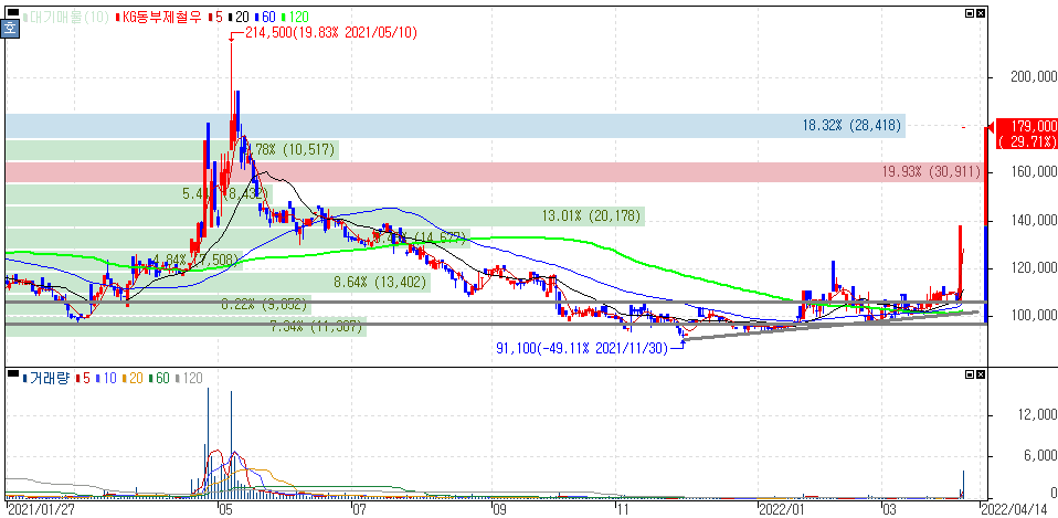 쌍용차 인수전 참여 소식에 KG그룹주 상승 속 상한가를 기록한 KG동부제철, KG동부제철우 주가 입니다.
