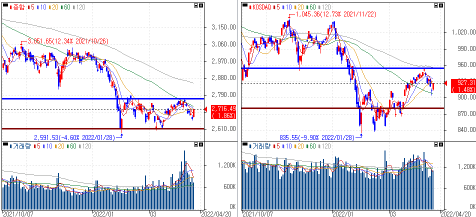 금일 코스피 지수는 +1.86% 상승한 2,716.49에 마감하였고, 코스닥 지수는 +1.48% 상승한 927.31에 마감하였습니다. 미국 소비자물가지수 상승률이 당초 우려보다 낮게 나오면서 인플레이션 경계심리가 소폭 누그러져 외인과 기관의 매수세 속 상승을 보였습니다.