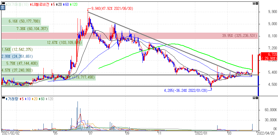 LG헬로비전은 작년 6월 고점 이후 일정한 하락세 흐름에 이어 작년 말부터 형성된 구간이 추세전환까지 이어지는 모습입니다. 요새 이런 식으로 반등을 보이는 종목들이 많이 있습니다. 다만 무작정 이런 패턴을 따라가기 보다는 주가 모멘텀과 실적 등 다양한 지표들을 잘 분석하는게 필요하겠죠.