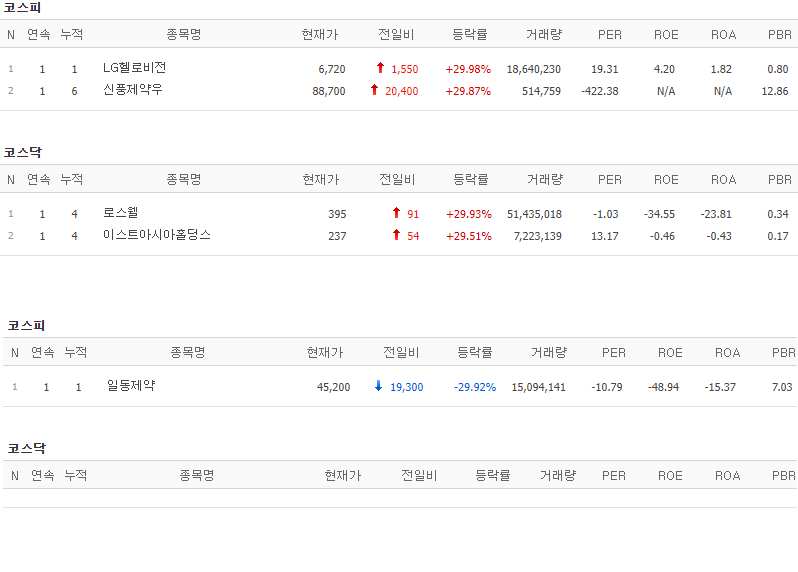 코스피에서는 LG헬로비전, 신풍제약우가 상한가를 기록했고, 코스닥에서는 로스웰, 이스트아시아홀딩스가 상한가를 기록했습니다. 반면 일동제약이 하한가를 기록했습니다.