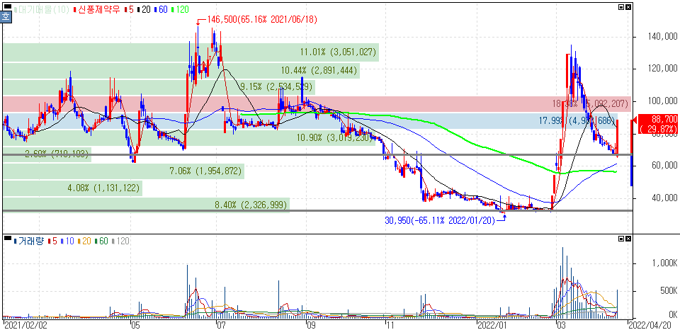신풍제약우은 과거 상당한 주가 상승률을 보이면서 일부 투자자들이 500,000원을 가즈아 외치던 종목이죠. 당시 고점 280,000원은 아직까지 돌아오고 있지 않은 가격으로 올해 30,000원까지도 하락했던 종목입니다.