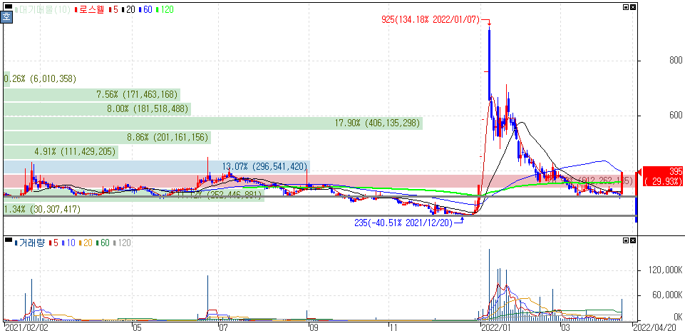 그리고 로스웰의 지난 가파른 급등 때 기억하실겁니다. 당시 추가상승을 보일지라도 주의해야 하는게 좋다고 누차 말씀드렸던 종목이죠. 이런 종목들은 당시 하락전환하더라도 따로 언급을 해드리지 않았지만 고점에 물리는 주식을 하는 분은 여기엔 안계실거라 봅니다.