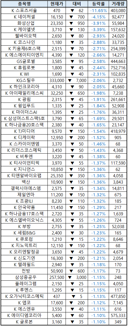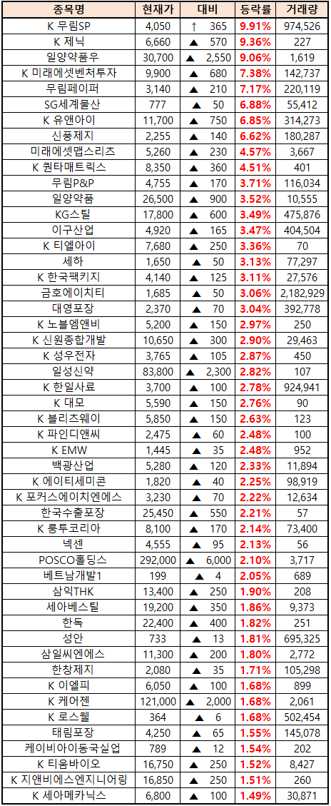 시간외 단일가매매 종가 종목 확인시 단순 급등주 등락률만 볼 것이 아니라, '거래량'에 따르는 거래대금도 판단하면서 보는 것이 중요합니다. (종목명 앞에 'K'는 코스닥 종목을 의미합니다.)