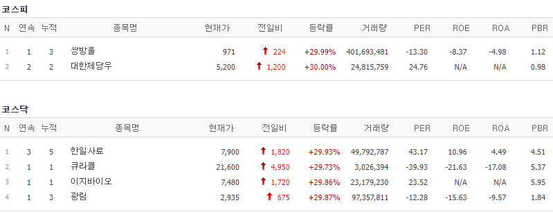 코스피에서는 쌍방울, 대한제당우가 상한가를 기록했고, 코스닥에서는 한일사료, 큐라클, 이지바이오, 광림이 상한가를 기록했습니다.
