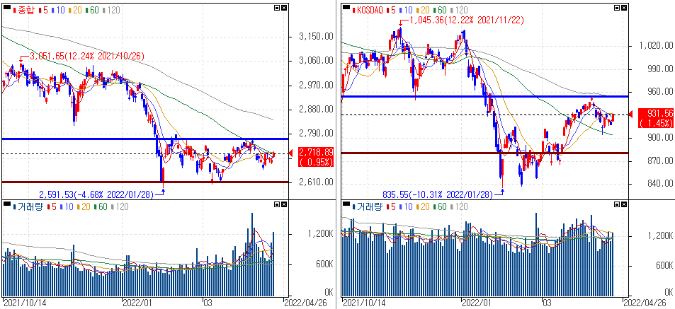 금일 코스피 지수는 +0.95% 상승한 2,718.89에 마감하였고, 코스닥 지수는 +1.45% 상승한 931.56에 마감하였습니다. 삼성전자와 SK하이닉스의 메모리 설비투자 확대 소식에 반도체 업종 상승이 지수 상승에 기여했습니다.