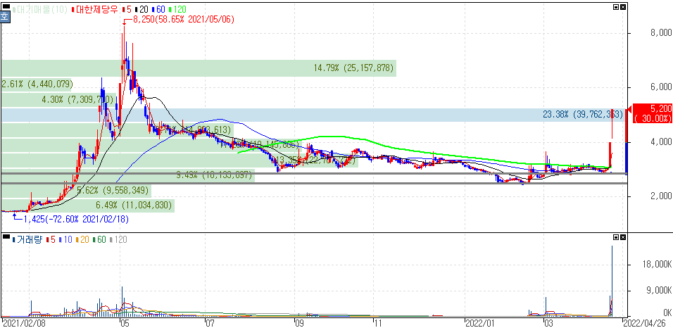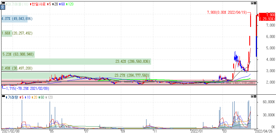 러시아-우크라이나 전쟁 장기화에 따른 곡물값 급등 지속 등에 사료, 비료 관련주 강세 속 상한가를 기록한 대한제당우, 한일사료, 이지바이오 주가 입니다.